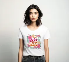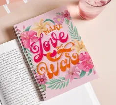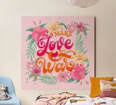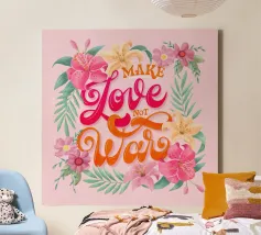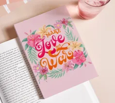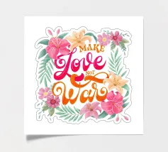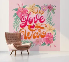 Bellissimi gigli disegnati a mano, altri fiori e foglie dettagliate. In combinazione con scritte a mano e uno slogan per la pace nel mondo: Make Love. Non la guerra. Colori armoniosi e ben strutturati, dal rosa chiaro ai toni del rosa, del giallo e dell'arancio, combinati con menta e verde lime.