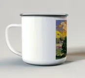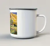 Una piccola fattoria è immersa in una valle di campi dorati e alberi verdi, con dolci colline sullo sfondo, che catturano un momento di pace perfetta in una campagna calda e illuminata dal sole.