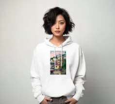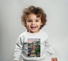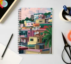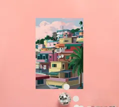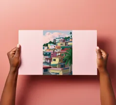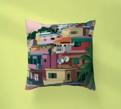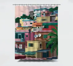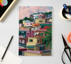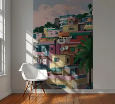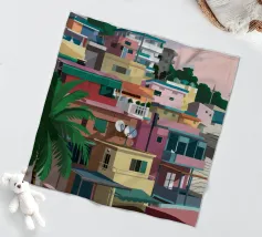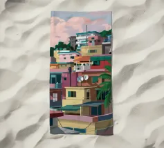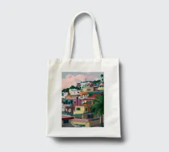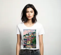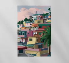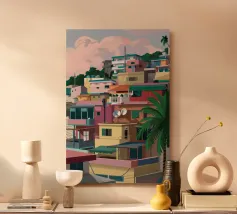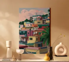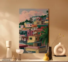 Un dipinto di una comunità collinare densamente popolata, come una favela brasiliana, con case colorate accatastate sotto un cielo morbido, che cattura la vivacità del luogo.