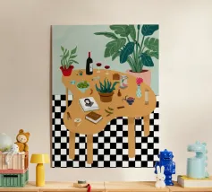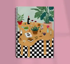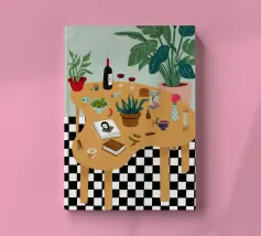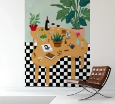 Una vivace natura morta di un pasto su un tavolo a scacchi bianchi e neri, con vino, piante e cibo, che suggerisce un delizioso banchetto all'aperto.