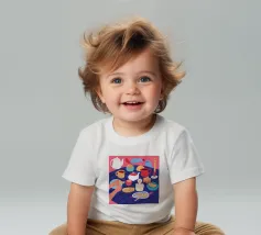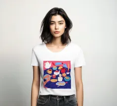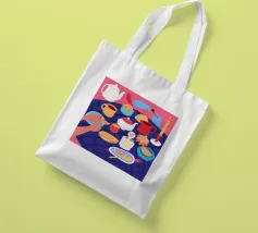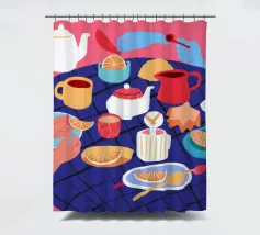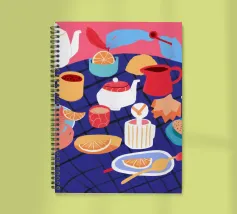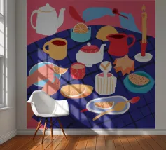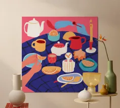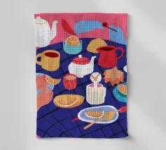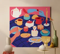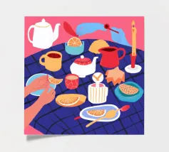 Una vivace e colorata natura morta di un tavolo da colazione visto dall'alto, carico di teiera, tazze, arance e pasticcini su una tovaglia a scacchi blu.