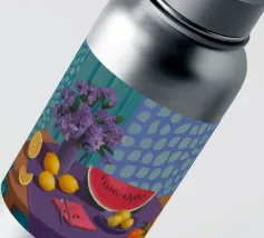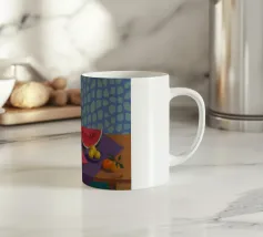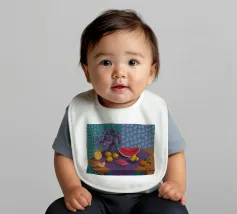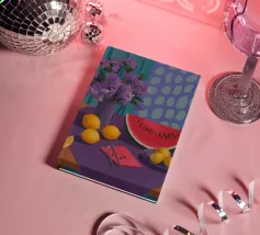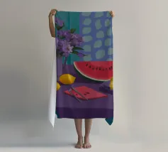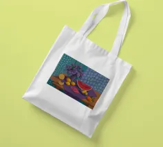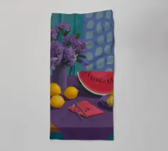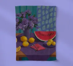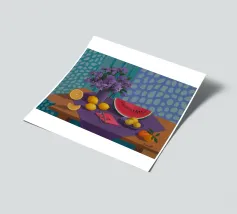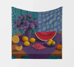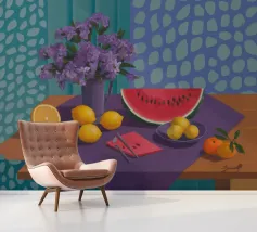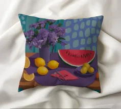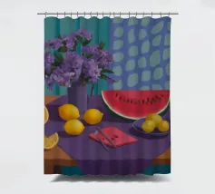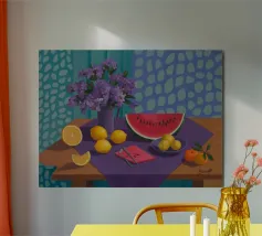 Una natura morta lunatica e suggestiva di un bouquet di lillà viola su un tavolo con limoni e una fetta di anguria. Lo sfondo scuro e modellato crea un senso di mistero e profondità in questa bella composizione.