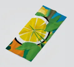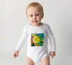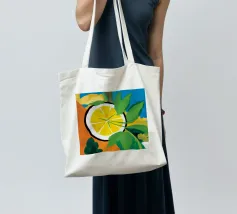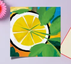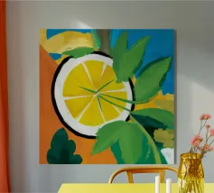 Un vibrante primo piano pittorico di un limone giallo scintillante e tagliato a fette su uno sfondo di foglie verdi e di un cielo azzurro, che cattura l'essenza della freschezza e dell'estate.