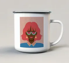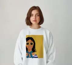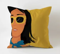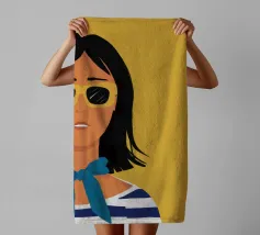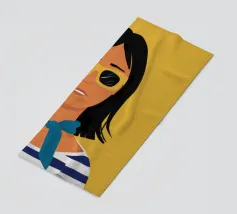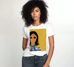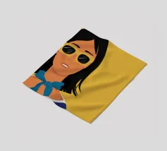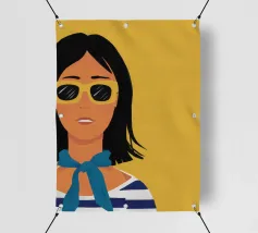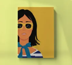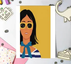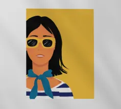 Un ritratto audace di una donna sicura di sé con capelli corti e scuri, che indossa occhiali da sole e un foulard blu, su uno sfondo giallo oro di grande effetto.