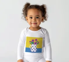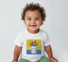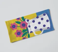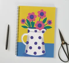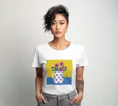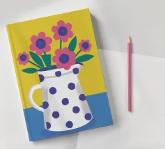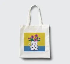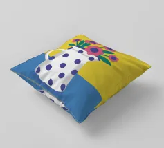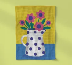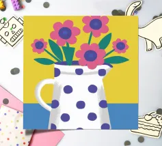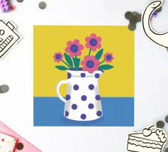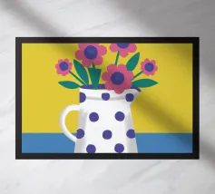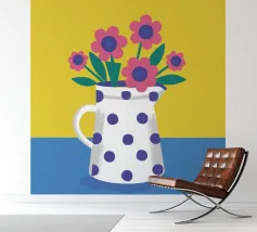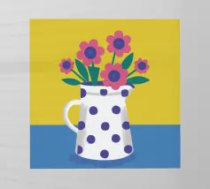 Un dolce e semplice bouquet di fiori colorati in una brocca bianca a pois blu. Lo sfondo è un'audace composizione a blocchi di colore giallo e blu, che crea un pezzo allegro, moderno e popolare.