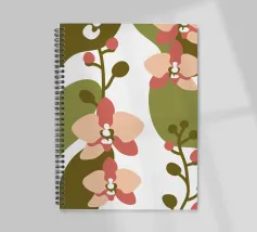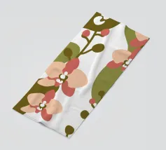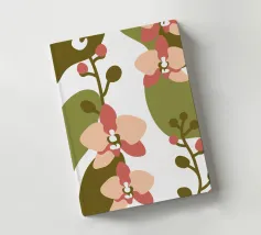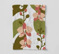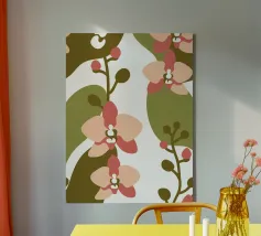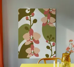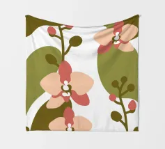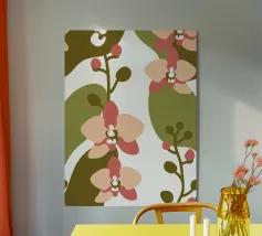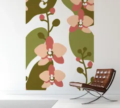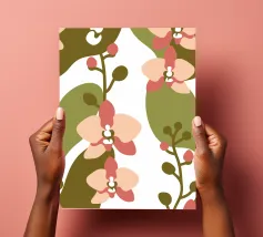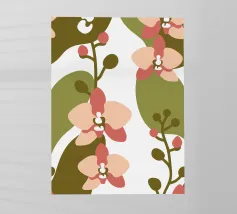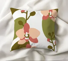 Illustrazione astratta con fiori di orchidea nei toni del rosa e del crema, foglie verde oliva e sfondo bianco.