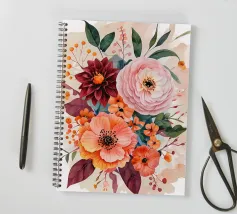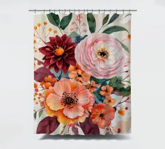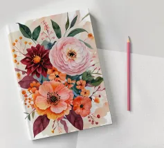 Quest'opera d'arte cattura la delicata bellezza di una composizione floreale resa in uno stile morbido e ispirato all'acquerello. I fiori rosa, bordeaux e arancioni sono al centro della scena e i loro petali presentano sottili sfumature e texture che suggeriscono un tocco pittorico. Foglie verdeggianti e bacche delicate aggiungono profondità e interesse visivo alla composizione, mentre le tenui pennellate di colore dello sfondo esaltano la qualità eterea e onirica dell'opera. È una celebrazione della delicata arte della natura, che evoca sentimenti di tranquillità e grazia.