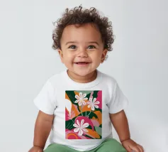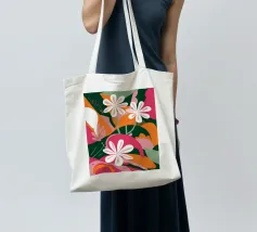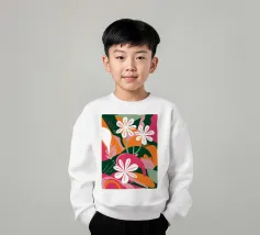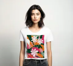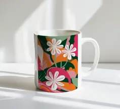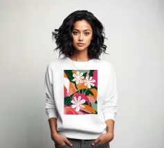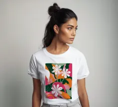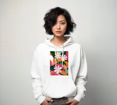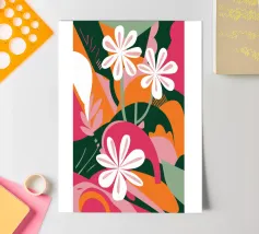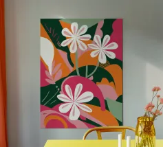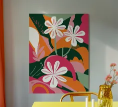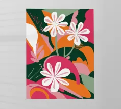Una splendida composizione astratta di fiori primaverili stilizzati, con morbidi petali bianchi e rosa, crea un pezzo floreale fresco, moderno ed elegante che celebra la bellezza delle nuove fioriture.