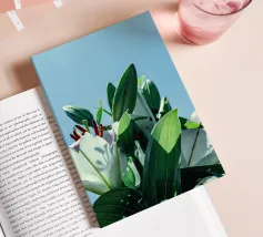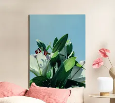 Ogni fiore si erge su un esile stelo verde, irradiando purezza e tranquillità. Il profumo morbido riempie l'aria, sottile ma rilassante, mentre il colore bianco puro simboleggia pace, innocenza e rinnovamento. Circondati da foglie verdi e rigogliose, i gigli ondeggiano dolcemente nella brezza, senza tempo e sereni".