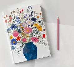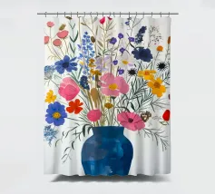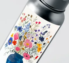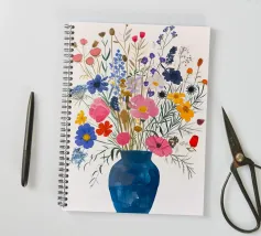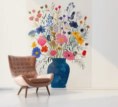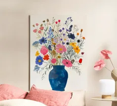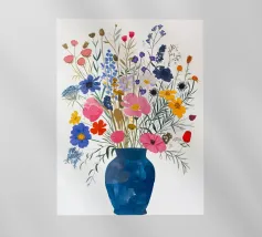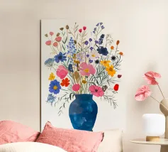 Questo allegro motivo mostra un magnifico bouquet di fiori di campo dai colori vivaci, disposti ad arte in un vaso blu intenso. La combinazione di delicate tonalità di rosa, giallo, blu e viola dona freschezza, leggerezza e bellezza naturale a qualsiasi ambiente. Il quadro cattura l'essenza dell'estate e trasmette un equilibrio armonioso tra eleganza e gioia di vivere. Perfetto per chiunque ami l'arte floreale - ideale per murales, tazze, cover per cellulari, cuscini, tende da doccia, magliette e poster.