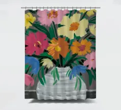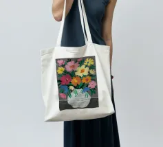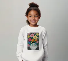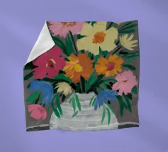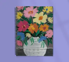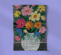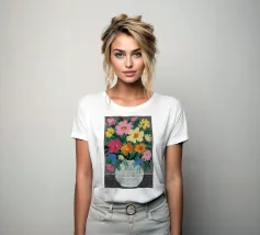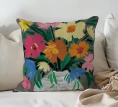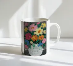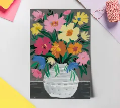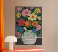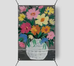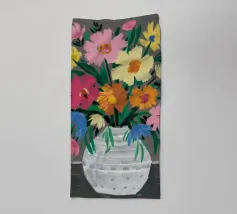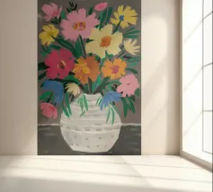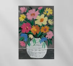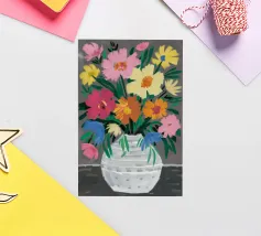 Un bellissimo bouquet pieno di fiori colorati che trabocca da un semplice cesto bianco intrecciato. La composizione è rustica ma vibrante e cattura il fascino di una composizione floreale abbondante e appena raccolta.