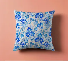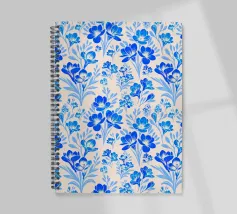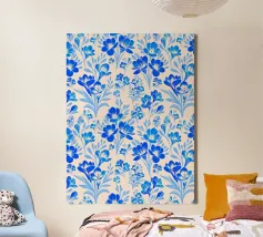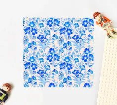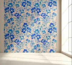 Splendida stampa floreale con fiori di fresia blu cobalto e foglie azzurre, su sfondo color crema.