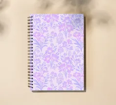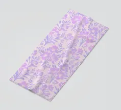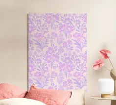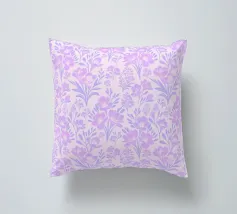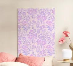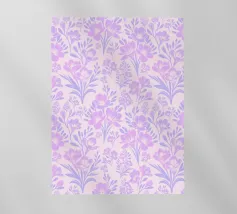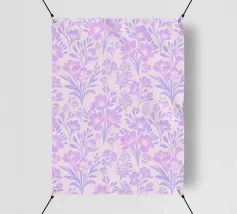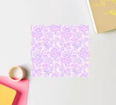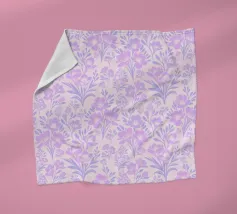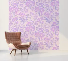 Graziosa stampa floreale con fiori di fresia rosa chiaro e foglie di lavanda, su uno sfondo rosa arrossato.