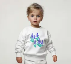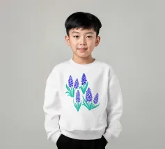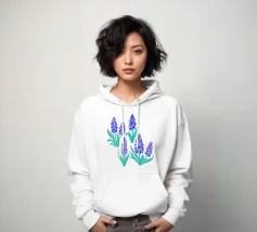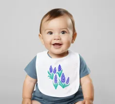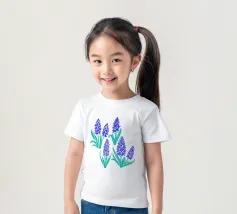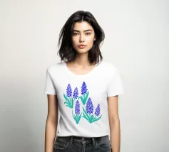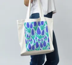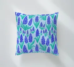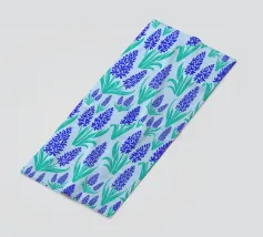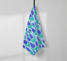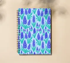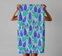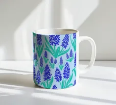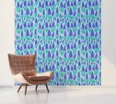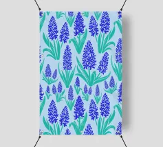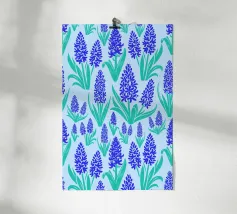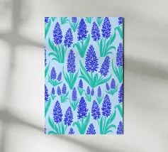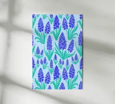Bellissima stampa floreale con fiori di giacinto blu cobalto e foglie verdi, su sfondo azzurro.