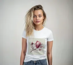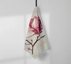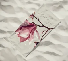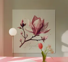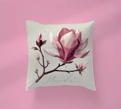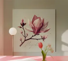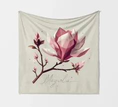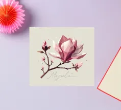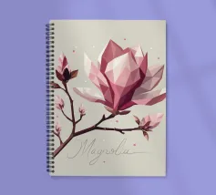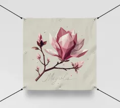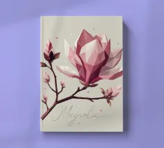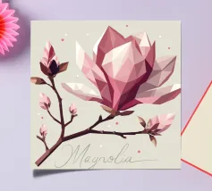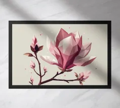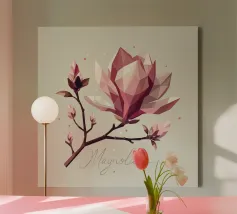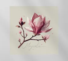 Questo elegante fiore di magnolia in un moderno stile low-poly esprime la forza tranquilla della natura. Delicato e grazioso, il fiore si dispiega in un armonioso gioco di toni rosa e crema. È sinonimo di freschezza, rinnovamento e tranquilla eleganza: un'immagine che porta pace e tocca il cuore.Raffigurazione in filigrana di un fiore di magnolia in un disegno geometrico