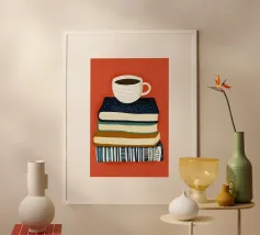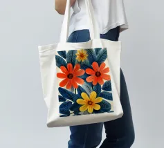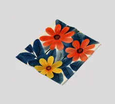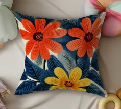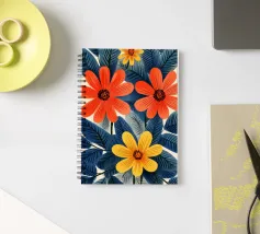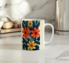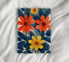 L'immagine mostra una rappresentazione stilizzata di fiori e foglie. Le foglie blu scuro formano un forte contrasto con i grandi fiori e conferiscono alla composizione una dinamica vivace. Lo stile è grafico e illustrativo, con forme chiare e colori decisi. La composizione appare moderna e armoniosa, quasi come un motivo decorativo o un'illustrazione digitale con un tocco di fascino retrò.