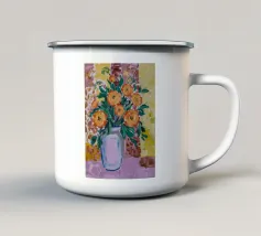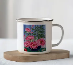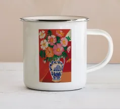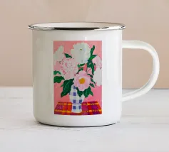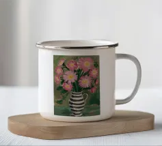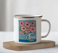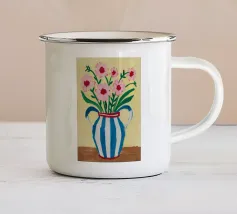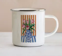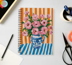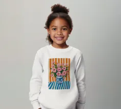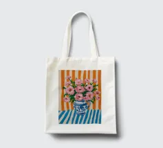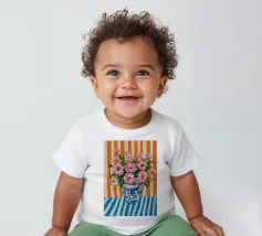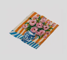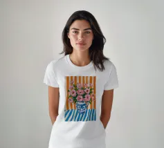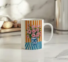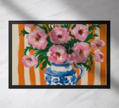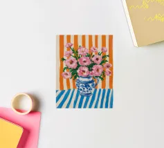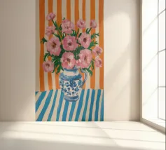 Una vivace natura morta presenta un bouquet di fiori bianchi e rosa in un vaso a righe bianche e blu, adagiato su una superficie con strisce altrettanto audaci su un caldo sfondo arancione, che emana un'atmosfera allegra e modernamente retrò.