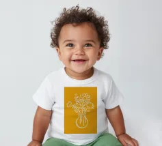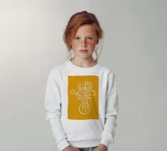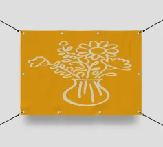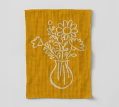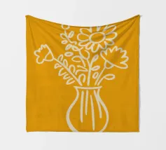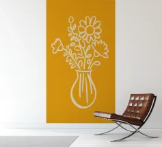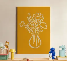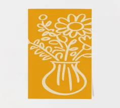 Disegno astratto di un vaso con fiori su sfondo giallo.