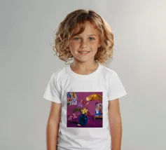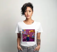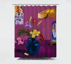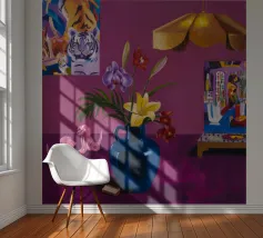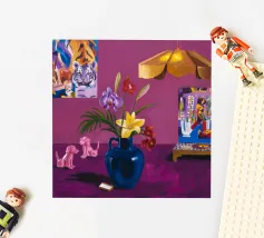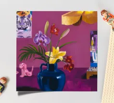 Un vaso blu scuro contiene un colorato assortimento di fiori misti, circondato da giocose figure giocattolo tra cui un unicorno e una persona, su una superficie gialla brillante davanti a una parete viola con poster.
