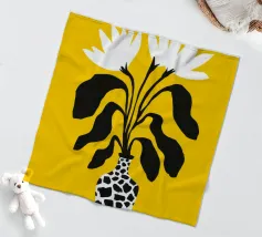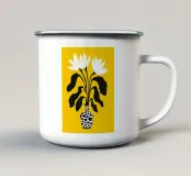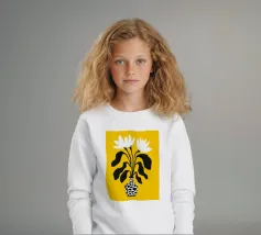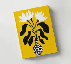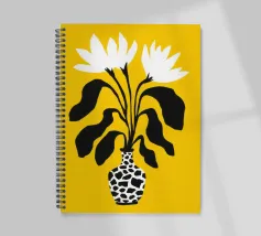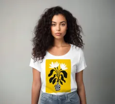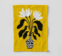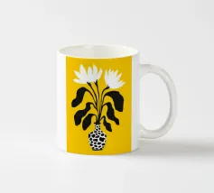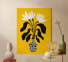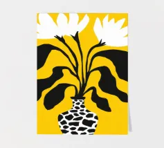 Una natura morta audace e allegra di fiori bianchi in un vaso nero a pois su uno sfondo giallo brillante. L'alto contrasto e l'estetica gioiosa ne fanno un pezzo solare e vibrante.