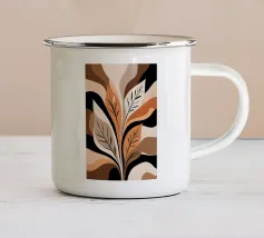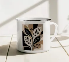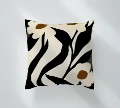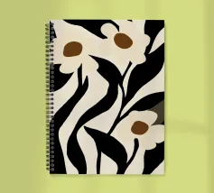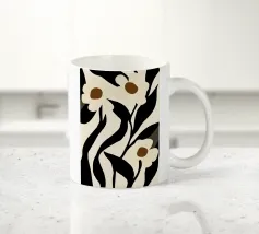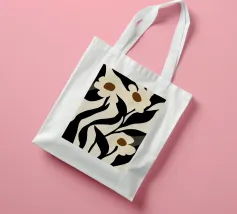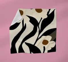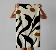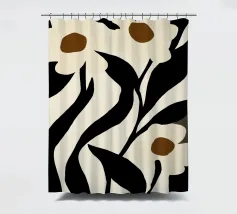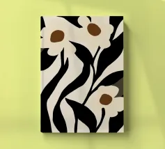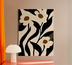 I toni neutri del beige e del nero formano una rappresentazione stilizzata di fiori con steli allungati. Tre fiori con centri rotondi di colore marrone creano una composizione semplice ma di grande effetto.