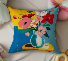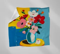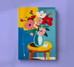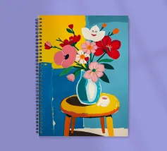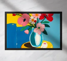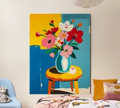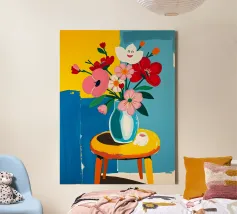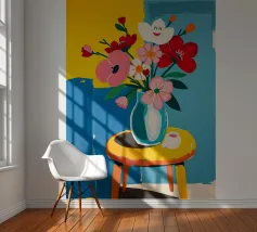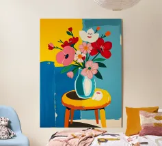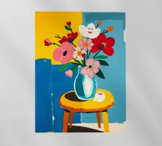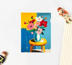 Fiore sorridente in vaso su sgabello di legno / tavolo di legno. Fiori colorati in arancione, rosso, bianco e rosa in un vaso blu.