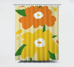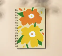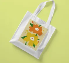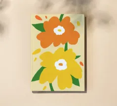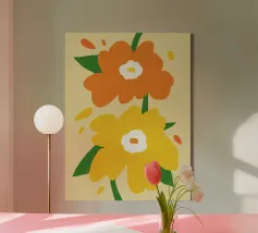 Fiori dai colori vivaci e dalle forme semplici e decise si stagliano su uno sfondo morbido, trasmettendo un'estetica allegra e giocosa. Due grandi fiori, uno arancione e uno giallo, sono completati da foglie verdi e accentuati da piccole forme decorative.