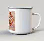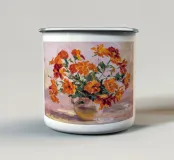 Un vaso semplice e terroso contiene un radioso bouquet di fiori arancioni brillanti, il cui colore caldo e solare risplende su uno sfondo morbido e strutturato in una composizione di natura morta allegra e invitante.