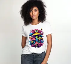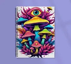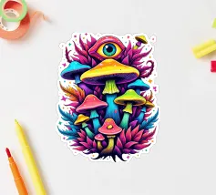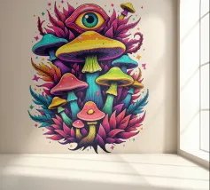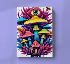 Tuffatevi in un mondo vibrante e surreale con questo disegno di funghi psichedelici. Caratterizzata da una collezione di funghi dai colori vivaci e da un occhio mistico, questa opera d'arte crea una scena sognante e incantevole. Perfetto per chi ama l'arte psichedelica, la fantasia e le immagini uniche e strabilianti.