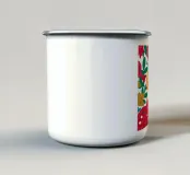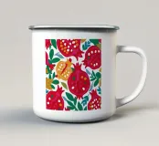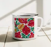 Un disegno vibrante e lussureggiante di melograni rossi maturi, alcuni aperti per rivelare i loro semi gioiello, intervallati da foglie verdi e fiori stilizzati. La composizione è una celebrazione ricca e fruttuosa dell'abbondanza della natura.