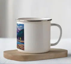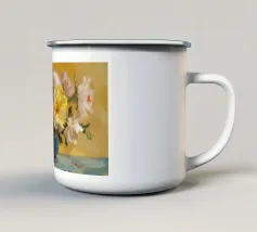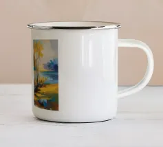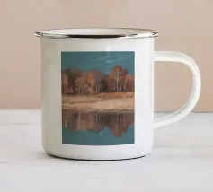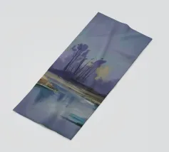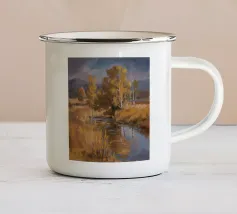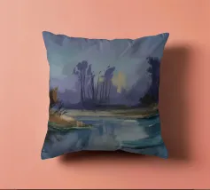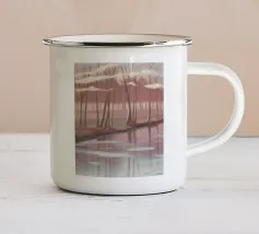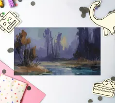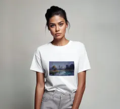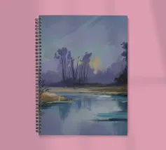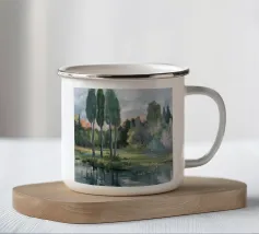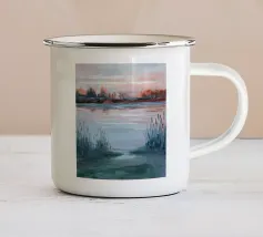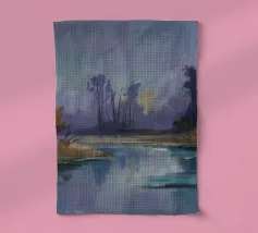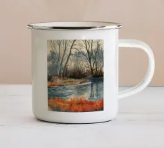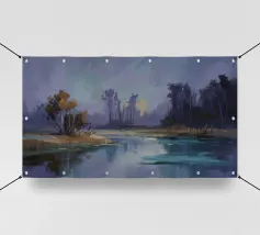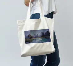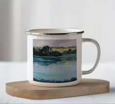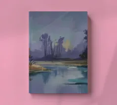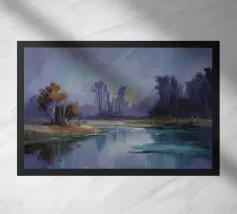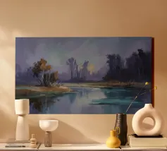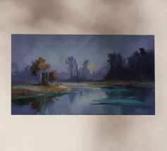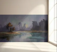 Un dipinto paesaggistico di un fiume o di un lago tranquillo che riflette i colori tenui di un cielo crepuscolare o nebbioso. Gli alberi spogli costeggiano la riva più lontana e l'atmosfera generale è serena e un po' malinconica.