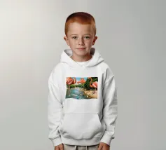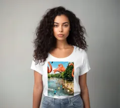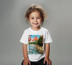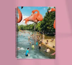Un gruppo di fenicotteri che se ne sta in riva a un fiume mentre un altro migliaio di persone si diverte a nuotare lì. Vibrazioni surreali e divertenti da spiaggia estiva. Collage originale di MsGonzalez