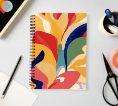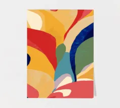 Una vibrante composizione astratta di forme floreali o di foglie simili a fiamme in colori vivaci, tra cui giallo, arancione, rosso, blu e rosa, su uno sfondo scuro. L'opera d'arte è energica e appassionata ed evoca una fioritura ardente.