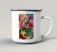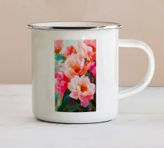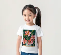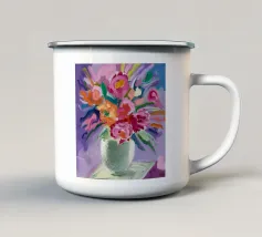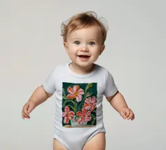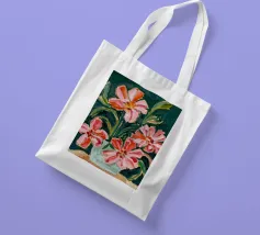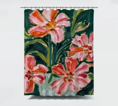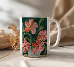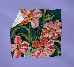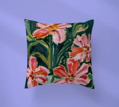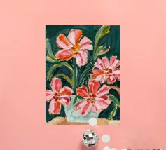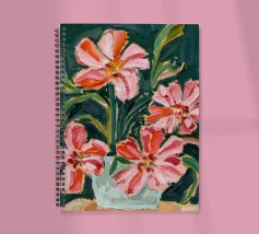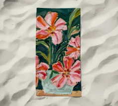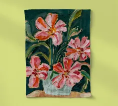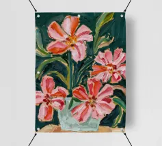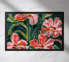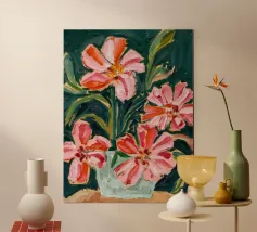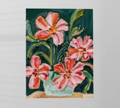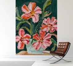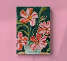 Un'energica natura morta con grandi e vibranti fiori arancioni e rosa, forse cosmi o dalie, che spuntano da un vaso trasparente o chiaro su uno sfondo scuro in contrasto.