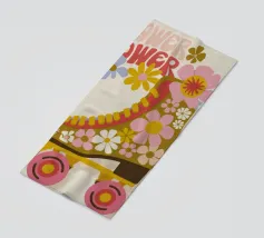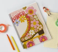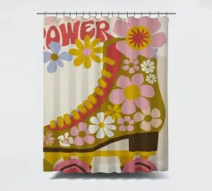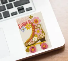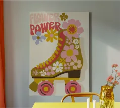 Questo dipinto raffigura un pattino a rotelle ornato di fiori colorati e la scritta "Flower Power" in un carattere giocoso. Lo sfondo è rosa chiaro e mette in risalto i colori vivaci dei fiori e del pattino.