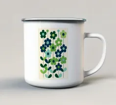 Un motivo di fiori stilizzati presenta grandi petali verdi e piccoli petali azzurri, ciascuno con un centro giallo. Il disegno è astratto e ripetitivo e trasmette un'estetica audace e moderna.