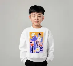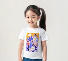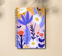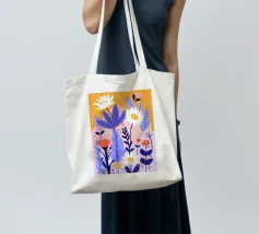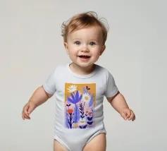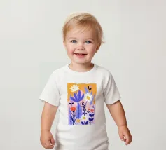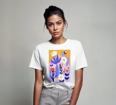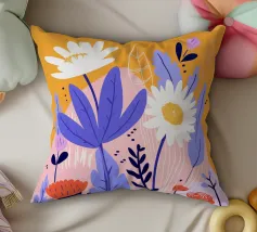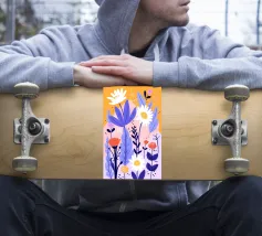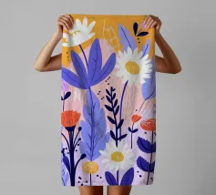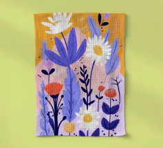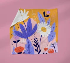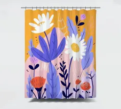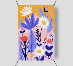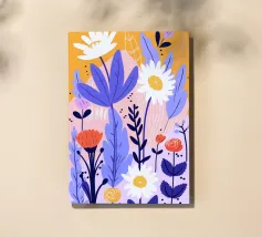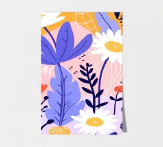 Una vivace serie di fiori e foglie stilizzati mette in mostra una tavolozza di viola, rosa e arancione. Forme audaci e colori contrastanti creano una composizione vivace e allegra.