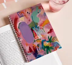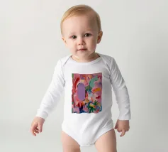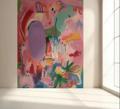 Una dinamica composizione astratta che esplode di rosa, arancioni, blu e verdi vibranti, con forme organiche fluenti e figure suggerite in energico movimento.