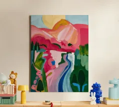 Un vivace paesaggio astratto con forme fluide che suggeriscono colline colorate, un fiume tortuoso e un cielo dinamico, in rosa, rosso, blu, verde e giallo.