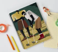 I golfisti stilizzati in toni tenui si concentrano su uno swing, evocando una calma precisione e una tranquilla determinazione.