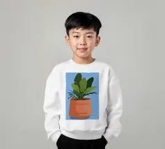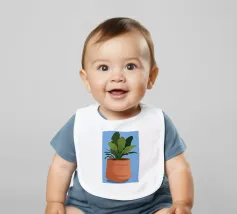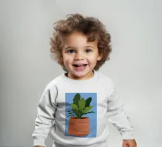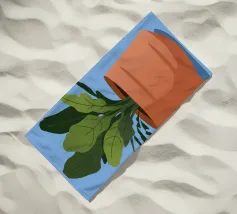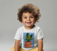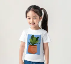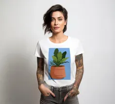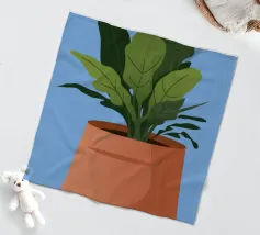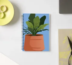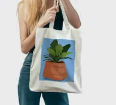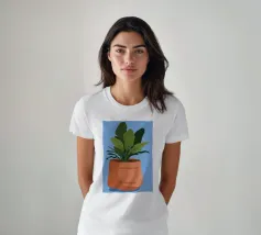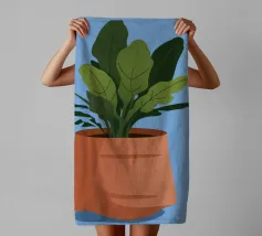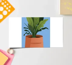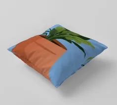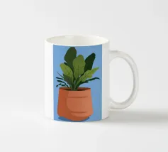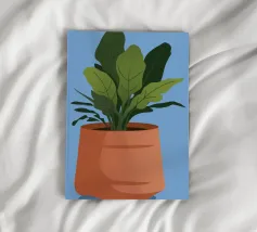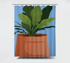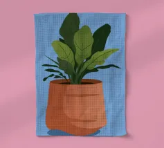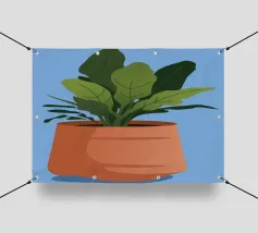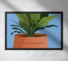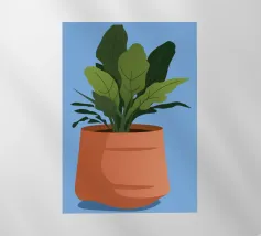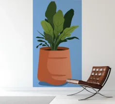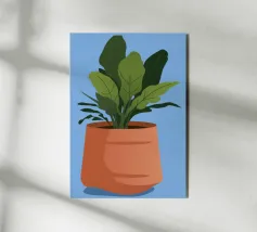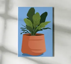 Questa immagine presenta una pianta in vaso con ampie foglie verdi in un vaso arancione su uno sfondo blu. I colori decisi e il design semplice creano un contrasto visivo di grande effetto.