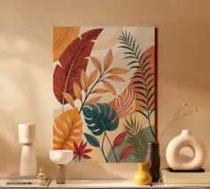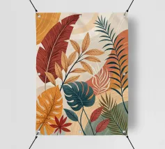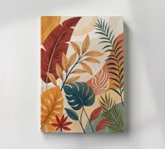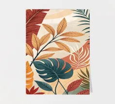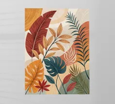 Questa vibrante e moderna stampa botanica cattura la bellezza lussureggiante di un paradiso tropicale con un tocco contemporaneo. Strati di fogliame dettagliato, tra cui foglie di monstera, palma e banano, sono resi in tonalità ricche e terrose di arancio bruciato, terracotta, verde acqua intenso e oro caldo. Le foglie sono collocate su uno sfondo morbido e astratto di curve fluide e forme organiche, creando una composizione dinamica ma rilassante. Con la sua sofisticata palette di colori e l'armoniosa miscela di elementi naturali e astratti, questo pezzo è perfetto per aggiungere un tocco di serena eleganza terrena a qualsiasi salotto, camera da letto o stanza da letto.