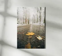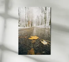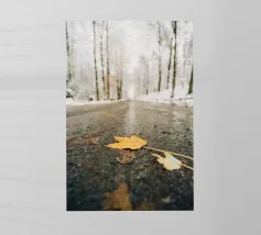 Ho scattato questa foto in una fredda giornata invernale nella Svizzera sassone. Questa foglia gialla autunnale giaceva sulla strada bagnata, mentre tutto intorno era già coperto di neve. Il mix di autunno e inverno rende la scena in qualche modo speciale: il momento giusto per una foto!