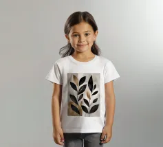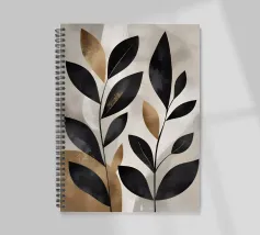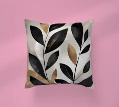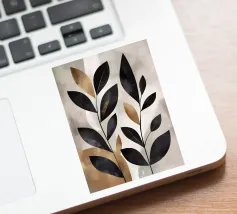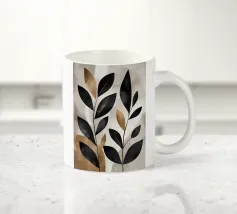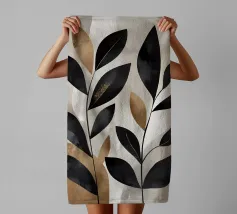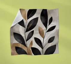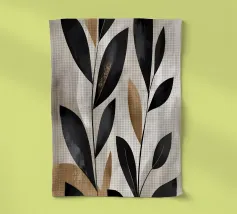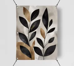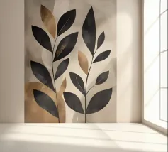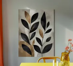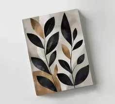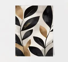 Questa opera d'arte astratta minimalista presenta foglie nere con accenti dorati su uno sfondo neutro. I colori contrastanti e le linee semplici creano un pezzo moderno ed elegante che aggiungerà un tocco di raffinatezza a qualsiasi spazio.
