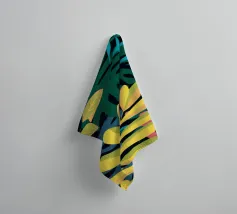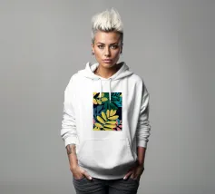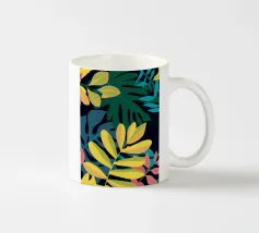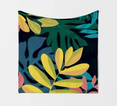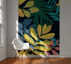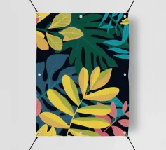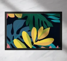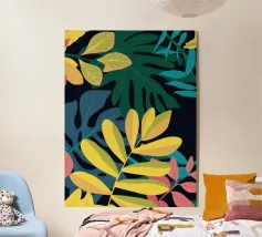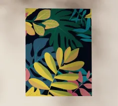 Una composizione semplice ma elegante di foglie giallo oro su uno sfondo scuro e profondo. L'elevato contrasto mette in risalto le forme aggraziate delle foglie, creando un pezzo botanico sofisticato.
