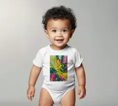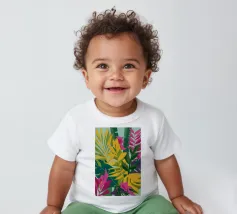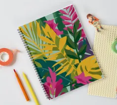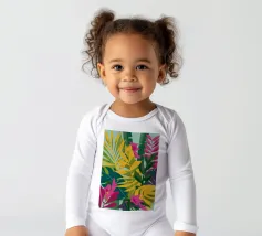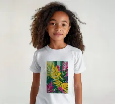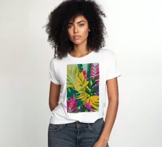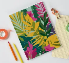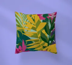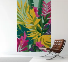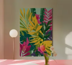 Una composizione densa e vibrante di varie foglie tropicali nei toni del rosa, del verde, dell'arancio e del giallo. Lo stile è audace e astratto e cattura la bellezza lussureggiante e selvaggia di una giungla.
