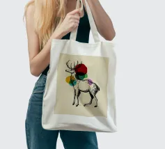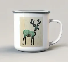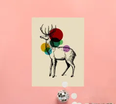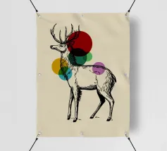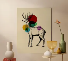 Una graziosa illustrazione a inchiostro nero di un maestoso cervo, ornata da audaci cerchi colorati sovrapposti che aggiungono un tocco moderno alla classica figura del bosco. Questo pezzo simboleggia l'equilibrio tra natura e arte astratta, rendendolo ideale per interni rustico-moderni o eclettici.