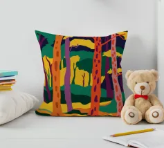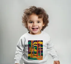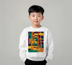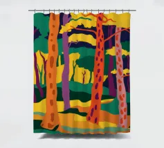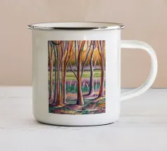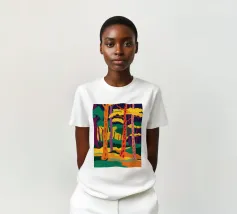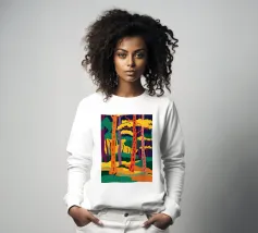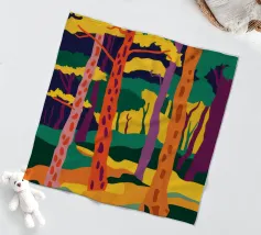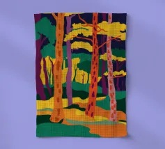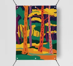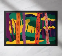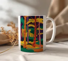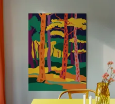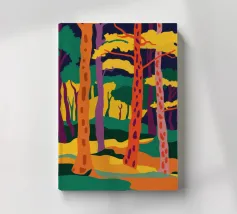 Una scena di foresta stilizzata con alberi alti e slanciati è immersa nella luce dorata dell'autunno, con una tavolozza calda di arancione, giallo e rosso che crea un'atmosfera tranquilla e bellissima.