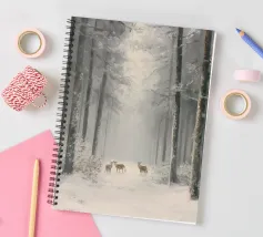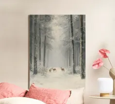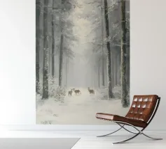 Questo suggestivo motivo invernale mostra una foresta innevata con alberi ad alto fusto, al centro della quale un piccolo gruppo di cervi si sofferma pacificamente. La leggera foschia conferisce alla scena un'atmosfera fiabesca e tranquilla che irradia calma e contemplazione. Perfetto per biglietti d'auguri natalizi, poster, calendari o come decorazione murale per la stagione invernale. Questa immagine trasmette la bellezza e la magia della natura in inverno.