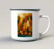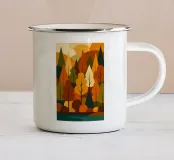 Una foresta nella stagione autunnale. Gli alberi hanno uno stile minimalista e geometrico, con forme lisce e arrotondate e blocchi solidi di colori caldi e terrosi in arancione bruciato, giallo senape intenso, verde oliva e ricco marrone arrugginito che dominano la tavolozza. Il fogliame è semplificato in forme triangolari e ovali, creando un motivo ritmico moderno.